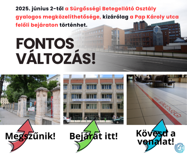 2025. június 2. hétfő, 06.00 órától a Sürgősségi Betegellátó Osztály a betegek és hozzátartozók részére gyalogosan, kizárólag a Pap Károly utca felőli betegbejáraton keresztül közelíthető meg. A Róbert Károly körút felől megszűnik a betegforgalom. A további részletekért kattintson IDE.