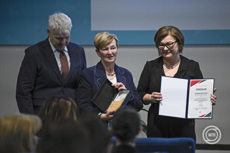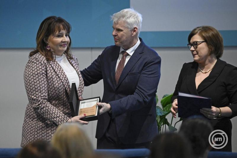 Budapest, 2026. február 19. Wikonkál Norbert Miklós főigazgató és Szabóné Darázs Mónika ápolási igazgató (j) átadja a Honvédkórházért Emlékplakettet Deli Máriának, az Országos Kórházi Főigazgatóság ápolási és betegbiztonsági igazgatójának a magyar ápolók napja alkalmából megrendezett I. szakdolgozói tudományos napon az Észak-Pesti Centrumkórház - Honvédkórházban 2026. február 19-én. MTI/Bodnár Boglárka