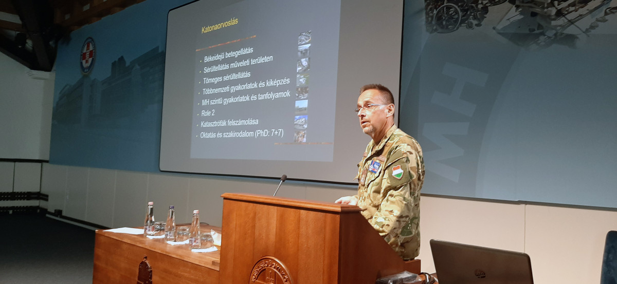Dr. Várhelyi Levente orvos ezredes, osztályvezető szerint a további sikeres működés lényegi elme az utánpótlás megtalálása és megtartása, majd számukra a tudás átadása, amit nem tart lehetetlen küldetésnek. Érdekes és szemléletes előadásában kitért arra a jelentős és rendkívüli tapasztalati bázisra, amit a műveleti területekről szereztek a honvédség misszióinak köszönhetően, lőtt-, robbantásos- és aknasérülések ellátásában is. Ezek, az orvosilag kivételes tapasztalatok hatalmas tudást hoztak a kórháznak az elmúlt évtizedekben. Felhívta rá a figyelmet, hogy azért jött a mai rendezvényre katonai gyakorlóöltözetben, mert: „a traumatológia nem öltönyös, hanem „gyakorlós” szakma”, hiszen a műtőben vérrel és verejtékkel megszerzett tapasztalat teszi őket igazán felkészültté.